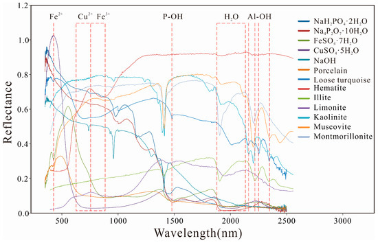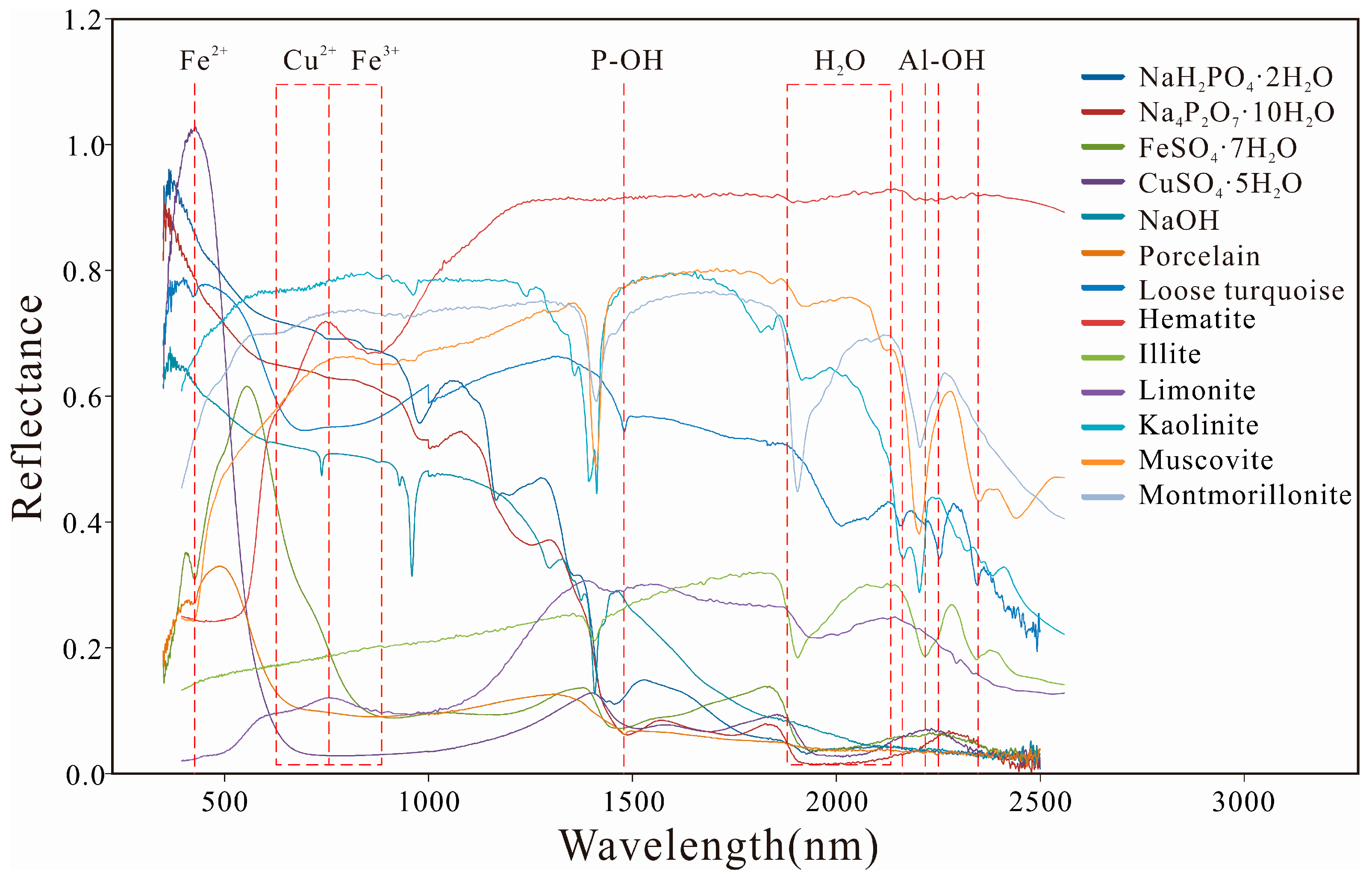 2O, and NaOH, and several rock minerals, such as hematite, limonite, illite, kaolinite, muscovite, and montmorillonite. The spectra of the above chemical compounds and minerals are shown in