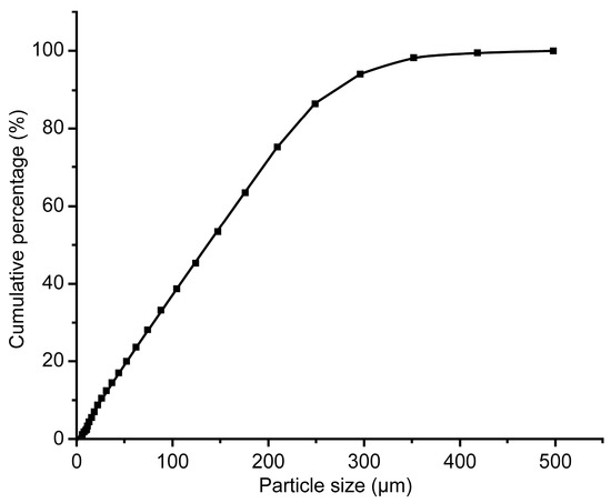 Ground silica containing 99.7 wt % of SiO2 (silica tailings, ST) was used in all prepared CPB samples. According to the generally accepted classification of tailings in China [21], the utilized ST material containing 7.17 wt % of fine particles and 71.87 wt % of coarse particles can be characterized as coarse tailings (Table 2). The measurements of Gs of ground silica conducted in this study conformed to the GB/T 208-94 [22] Chinese standard. Different particle distributions in the used tailings were determined using a particle size analyzer (Microtrac S3500, Microtrac, Montgomeryville, PA, USA), while various chemical and physical parameters of the ST material are described in Table 3 and Figure 1. The equations utilized for estimating the ST curvature and uniformity coefficients (Cc and Cu) are provided elsewhere [23].