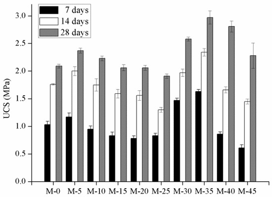 Mechanical tests were conducted in accordance with the JGJ/T 70 [25] Chinese standard. Each experiment was repeated three times, and the unconfined compressive strength (UCS) was determined for each specimen by averaging the experimental values obtained during three subsequent trials. MIP testing was performed using an Autopore instrument (IV 9500, Micromeritics, Atlanta, GA, USA).