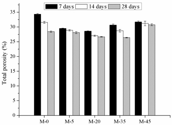 The total porosity of the five representative mortar specimens is described in Figure 3. It can be concluded that the longer is the curing period, the larger is the yield of the cement hydration products. The filling effect observed for the hydration products resulted in a reduction of the total material porosity. Thus, the curing time and total porosity of the produced CPB specimens are highly correlated, owing to the continuous reaction between the binder and the water species (similar results were obtained in previous studies [31,32]). The UCS values can be strongly influenced by the total porosity, but determining the total porosity is not sufficiently assessing the mechanical strength at a certain curing age. The mortar samples M-20 and M-45 are characterized by smaller total porosities and UCS values as compared to those obtained for M-0 after 7 days of aging. On the other hand, M-5 and M-35 have smaller total porosities and higher UCS values than M-0 does after 7 days of aging. The UCS value also is related with other factors, such as the amount of the cement and chemical composition of the mixtures [19].
