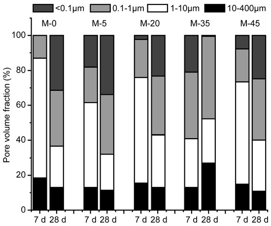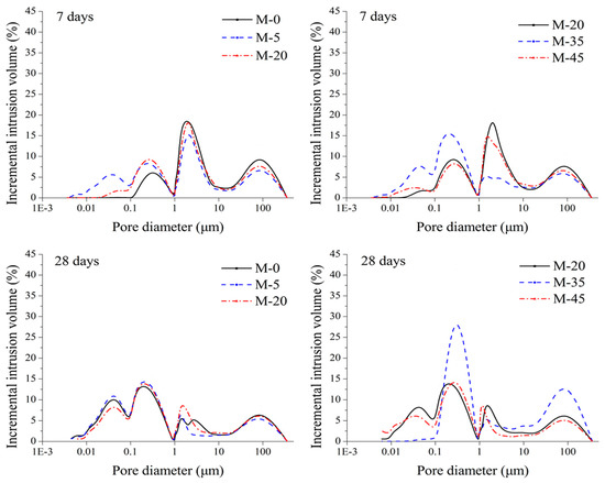The following four characteristic ranges of pore sizes with corresponding distribution peaks were observed: 10–400 μm (R1), 1–10 μm (R2), 0.1–1 μm (R3), and <0.1 μm (R4). After 7 days of curing, samples M-5 and M-35 with higher UCS values exhibited finer porous structures in the R1 and R2 regions (as compared to the other specimens). The porosity of sample M-5 is lower than that of samples M-0 and M-20 in the R1 and R2 regions and that the porosity of M-35 is lower than that of samples M-20 and M-45 in the R1 and R2 regions. However, after 28 days of curing, sample M-5 was characterized by less pores in the R1 and R2 regions, while sample M-35 exhibited an opposite trend. Sample M-5 has less pores than samples M-0 and M-20 in the R1 and R2 regions, while sample M-35 has more pores than samples M-20 and M-45 in the R1 and R2 regions. At the same time, the observed relationship between the UCS and the pore volume in the R3 and R4 regions was ambiguous.