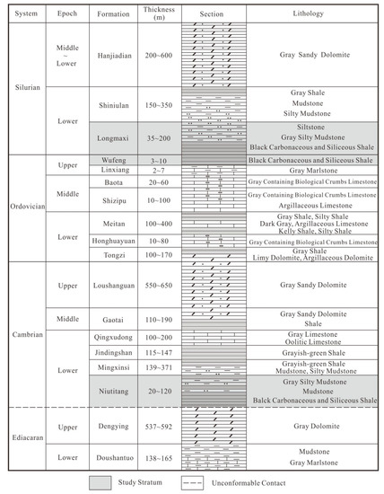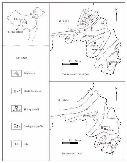 The study area is located in the southeastern margin of the Sichuan Basin (Figure 1). Geographically, it covers Fuling, Pengshui, Youyang, and Xiushan counties. This area has undergone multiple stages of tectonic activity, including the Caledonian orogeny (542–386 Ma), Hercynian orogeny (386–257 Ma), Indo-China movement (257–205 Ma), Yanshan movement (205–65 Ma) and Himalayan orogeny (beginning 65 Ma) [20,21]. This multistage tectonism was responsible for the complexities of the geological setting, such as numerous faults (some now active), universally steep dips and high tectonic stress [20]. Regarding the litho-stratigraphy of the study area, there are three typical marine shale formations, which from the top to the bottom consist of the LSL, UOW and LCN (Figure 2). The topmost shale is the LSL, with a thickness ranging from 35 m to 200 m and a maximum burial depth of 4900 m [21]. The UOW lies beneath the LSL and forms a conformable contact with the overlying LSL (Figure 2). The thickness of the UOW varies from 3 m to 10 m [22]. The LCN, located at the bottom of the Cambrian strata, possesses a maximum burial depth of 5500 m and a thickness of approximately 20–120 m [10]. The sedimentary center of the LSL and UOW is located in the northern study region, while that of the LCN lies in the south of the study area [9,10]. Therefore, the LSL and UOW are thicker in the central and northern study region than in the southern study region, whereas the LCN is thicker in the southern study region (Figure 1).