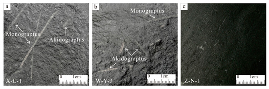 All samples collected from the LSL, UOW, and LCN can be described as black carbonaceous shale (Figure 3). Graptolites such as Akidograptus and Monograptus were common in the LSL and UOW samples (Figure 3a,b), but not in the LCN shales. This is a key characteristic distinguishing the LCN shale from the LSL and UOW shales.