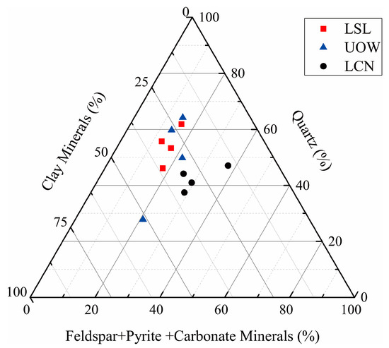 The mineralogical analyses of the study shales are presented in Table 1 and Figure 4. The mineralogy of all collected samples is similar: all samples are dominated by quartz, followed by the feldspars, carbonates, pyrite and clay minerals, and the samples only differ in the percentage of certain minerals (Table 1, Figure 4). The quartz content of the LSL shale (averaging 54.3%) is higher than that of the UOW shale (50.4%) and LCN shale (42.45%). The average contents of feldspar, pyrite and the carbonate minerals in the LCN shale are the highest among the three studied shales. The contents of clay minerals in the LSL and UOW shales have similar values, with averages of 30.0% and 31.7%, respectively, while the LCN shale has an average clay mineral content of 27.4%.