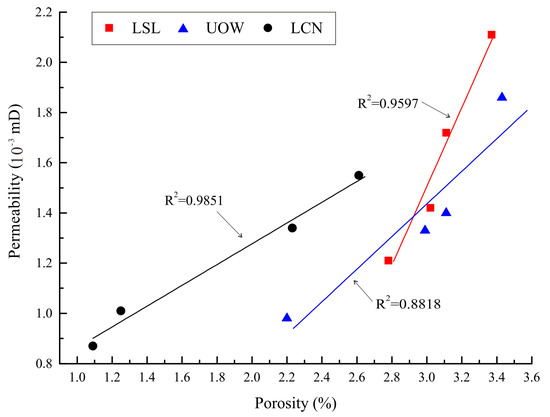 The permeability possesses a positive correlation with porosity for the collected shales (Figure 5), indicating that pores are the primary contributors to permeability. Moreover, based on the limited number of samples, the slopes of the three fit lines in Figure 5 show that the porosity contribution to permeability is much more significant in the LSL shale than in the UOW and LCN shales. However, further study is needed to confirm this with enough samples.