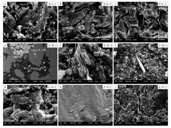 Images of pores and fractures from the collected shale samples using SEM inter-P (inter-particle pores), intra-P (intra-particle pores), OM-P (organic matter pores): (a–c) pores and fractures in LSL shale; (d–f) pores and fractures in UOW shale; (g–i) pores and fractures in LCN shale.