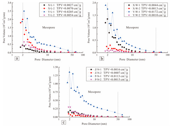 Plots of the pore size distribution (PSD) of collected samples derived from the N2 adsorption experiments using the Barrett–Joyner–Halenda (BJH) model. TPV (total pore volume): (a) LSL shale; (b) UOW shale; (c) LCN shale.