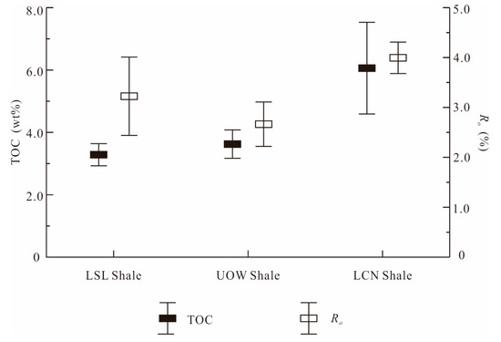 The average Ro of the LCN shale (4.04%) is also the highest, whereas the Ro of the UOW and LSL shales average 2.76% and 3.10%, respectively (Table 1; Figure 8). This indicates that all of the collected shales are over-mature (Ro > 2.0%), and that the LCN shale is highly over-mature (Ro > 3.5%). Wang et al. [32] observed that some of the organic matter in the LCN shale had been carbonized at a highly over-mature stage. During carbonization, a subset of the organic-matter pores were destroyed or collapsed. This carbonization may partially explain the lower average porosity of the LCN shale.