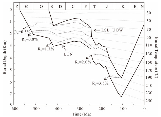 The burial history of LSL, UOW and LCN in the study area. (Modified from Tao et al. [36]).
