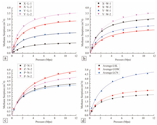 Langmuir isothermal adsorption curves of the selected shales. (a) LSL shale; (b) UOW shale; (c) LCN shale; (d) average statistics.
