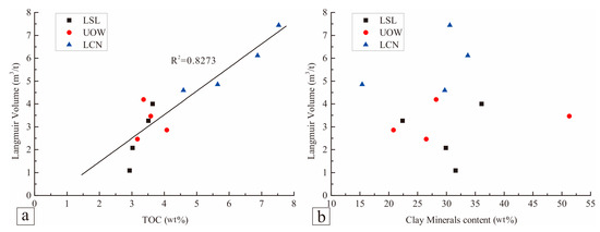 Relationships of (a) Langmuir volume vs. TOC content; and (b) Langmuir volume vs. clay mineral content.