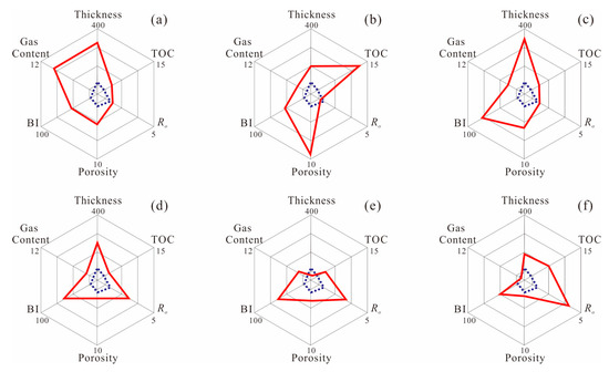 To evaluate the gas production potential of the shale reservoir, we considered formation thickness, TOC, Ro, porosity, BI and in situ gas content [41,42]. We also compared the three shales with marine shales of North America in Figure 12. The data from the North American shales show that commercial gas production can be achieved in shales with different geological characteristics. For example, the Barnett shale has a high gas content and shale thickness (Figure 12a), and the New Albany shale has extremely high TOC content and high porosity (Figure 12b), while the Ohio shale is fairly favorable in shale thickness and brittleness properties (Figure 12c). The shale data from North America and China confirm that there is a minimum threshold value for commercial shale gas development. In this study, we used the criteria in Wan et al. [43] to evaluate the three investigated shales.
