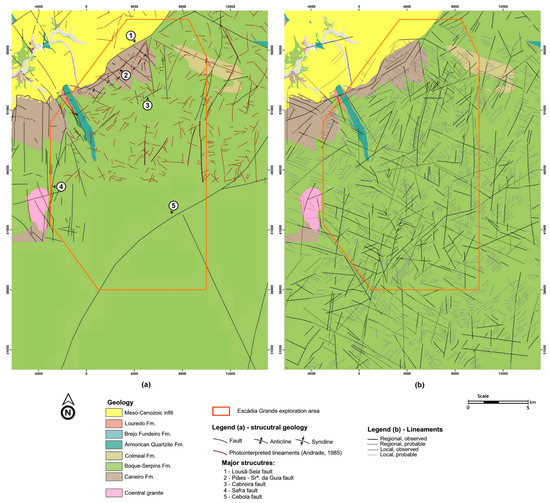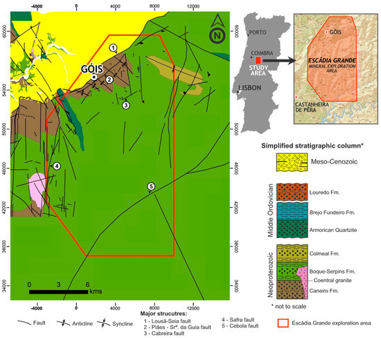 Figure 2. Location of the study area (including the mineral exploration area of Escádia Grande), simplified lithostratigraphic column and geological map (after [17,18,19,20]). The major tectonic structures of the region are numbered.
