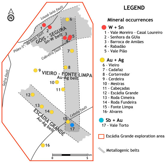 Figure 3. Mineral occurrences and metallogenic belts within the Escádia Grande exploration area (locations of the mineral occurrences and metallogenic belts E.D.M., S.A. and SIORMINP [34]).