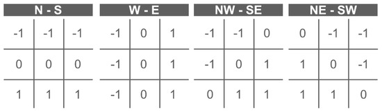 In this work, the four directional filters depicted in Figure 4 were applied to the Landsat 8/OLI B6 (1.57–1.65 µm—short wave infrared) and to most of the band ratios previously mentioned.