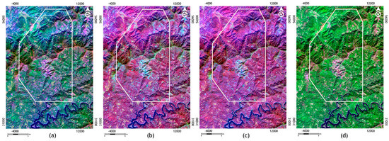 Figure 5. RGB colour composites used for geological interpretation: (a) 6-5-10; (b) 5-7-11; (c) 5-8-10 and (d) 7-5-2.
