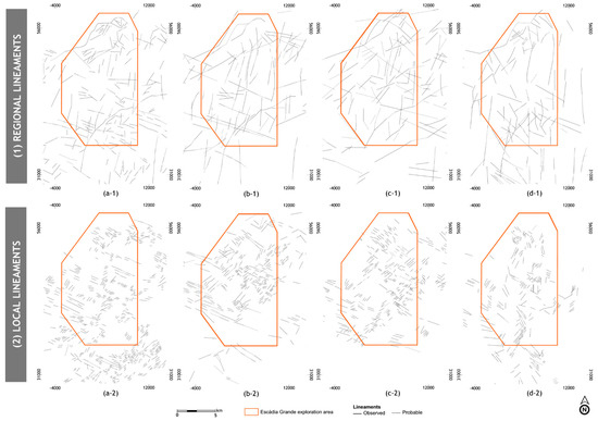 The use of the word lineament through the present work is based on the broader concept proposed by O’Leary et al. (1976) [44]. Therefore, lineaments are seen as rectilinear or slightly curvilinear features that are the reflection of geological phenomena occurring on the Earth’s surface. This concept, consequently, includes an array of features including diverse geological meanings (e.g., faults, shear zones, joint patterns, bedding, and intrusive structures) and other features that may not have a direct geological significance but may be replicating the underlying geological structure (e.g., aligned water courses and valleys, topographical alignments, vegetation contrasts and aligned natural springs).
