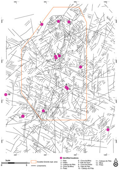 In the course of this work, the abundant use of particular Portuguese toponyms directly related to geology and even to possible mining works (mina and pião/peão) was noted. The association between these particular toponymies, their geographical positioning and their possible geological association became apparent after the superimposition over the lineament map. In Figure 19, which shows these places of particular toponymy (found in the 1:25,000 scale Portuguese Military Cartography), it can be easily seen that most of them appear to be related with the mapped lineaments, especially those comprising the Au-Ag metallogenic belt of Escádia Grande (Figure 20—locations (8,9)) and the NNW–SSE trending lineaments that, as previous mentioned in Section 4.4.2, may be closely related to Au-Ag occurrences (Figure 20—locations (4–6,12)).