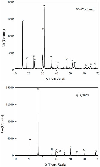 The pure samples of wolframite and quartz minerals were obtained from Yaogangxian, Hunan Province, China. The chemical composition of wolframite given in Table 1 shows that its purity was greater than 97%. XRD analysis of wolframite and quartz (see Figure 1) also confirm that the samples had little impurities.