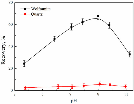 The effect of pH value on the flotation behavior of −10 μm wolframite and quartz (COHA = 30 mg·L−1).