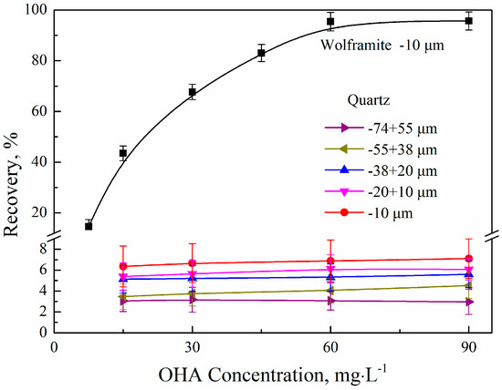 The effect of octyl hydroxamic acid (OHA) concentration on the flotation behavior of −10 μm wolframite and quartz of different size fractions (pH = 8.5–9.0).