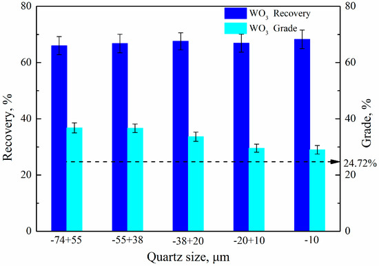 Flotation recovery of quartz of different size fractions in the dissolved solution of wolframite (pH = 8.5–9.0).