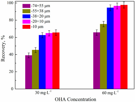 The flotation recovery of quartz of different size fractions, using the dissolved solution of wolframite as a flotation medium, is presented in Figure 5. The results show that the recovery of quartz of five different size fractions increased with collector concentration and decreasing particle size. When OHA concentration was 30 mg·L−1, the recoveries of –74 + 55 μm, –55 + 38 μm, –38 + 20 μm, –20 + 10 μm, and –10 μm fractions increased by 35.90%, 41.51%, 57.32%, 57.90%, and 58.11%, respectively, compared to quartz in distilled water. We also found that the flotation recovery of quartz increased rapidly with OHA initial concentration, and the recovery of –38 μm quartz was close to that of –10 μm wolframite (Figure 5).