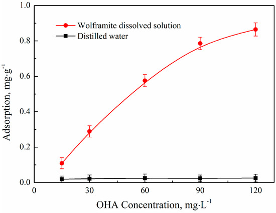 Figure 6 shows the adsorption behavior of OHA on quartz surfaces as a function of collector concentration. The results in Figure 6 indicate that significant differences existed in the adsorption behavior of OHA on quartz surfaces treated in the dissolved solution of wolframite compared to distilled water. OHA scarcely adsorbed onto the quartz surface in distilled water. Nevertheless, the adsorption of OHA on quartz increased with the rise in collector initial concentration at a pH of 8.5–9.0 in the dissolved solution of wolframite, which agreed with the flotation behavior of quartz shown in Figure 3 and Figure 5. These results suggest that metal ions dissolved from wolframite surface would activate the quartz surface and improve the adsorption of OHA. Quartz, with induced hydrophobization, was floated out along with fine wolframite, which led to a decrease in the grade of wolframite concentrate.