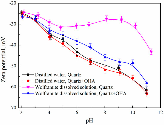 After that, in the presence of OHA, the negative charge of quartz significantly decreased in alkaline conditions. At a pH of 9.0, the zeta potential of quartz decreased by –20.4 mV, from –27.8 mV to –48.2 mV. When quartz was treated with OHA in the dissolved solution of wolframite, the extent of variation of zeta potentials was more obvious than that in distilled water, which was ascribed to the increase in OHA adsorption on quartz surfaces (see Figure 6). These results indicate that metal ions dissolved from wolframite could activate the surface of quartz and further stimulate the interaction between OHA and activated quartz. OHA is an anionic collector, and the activated quartz emerged with a negative charge. The presence of OHA made quartz more negatively charged in the dissolved solution of wolframite, suggesting that specific adsorption of OHA on the activated-quartz surface might be involved [13].