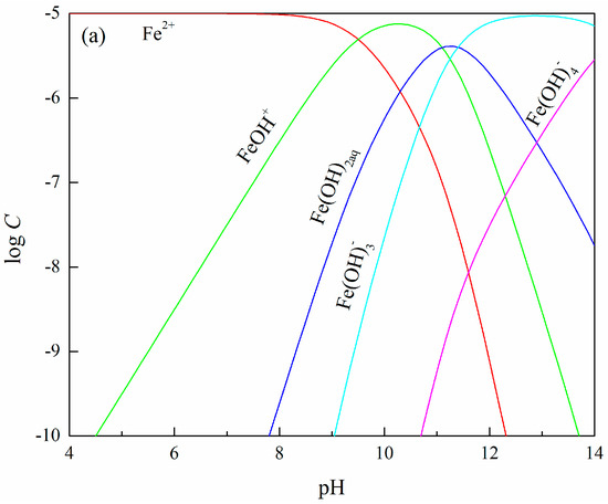 In the dissolved solution of wolframite, zeta potentials of quartz were still negative in the measured pH range, but the surface charge of quartz became less negative compared to quartz in distilled water, especially within the pH range of 7.0–10.0. Therefore, we confirmed that the surface property of quartz could be modified by metal ions dissolved from wolframite. Figure 8 shows the distributions of Fe2+ and Mn2+ species as a function of pH, under ion concentrations of 10−5 mol·L−1, which were calculated according to the stability constants and solubility products [14,20]. The system was unsaturated concerning any insoluble or precipitated species at all pH values. The correlation of metal ion species distributions with zeta potential results indicates that the positively charged Fe2+/Mn2+ and Fe(OH)+/Mn(OH)+ species were the dominant species when pH value was below 10.0, resulting in a positive shift of the zeta potential due to electrostatic attraction. At pH > 10.0, / and / species increased, and the zeta potentials of quartz dropped. Meanwhile, within the pH range of 6.0–9.0, the concentration of Fe(OH)+/Mn(OH)+ species became significant. The zeta potential of quartz increased sharply due to the specific adsorption via Fe2+/Mn2+ hydroxyl compounds coating onto the quartz surface. The electrokinetic behavior of quartz in the dissolved solution of wolframite was attributed to metal ions being adsorbed onto the negatively charged surface of quartz [9,11].