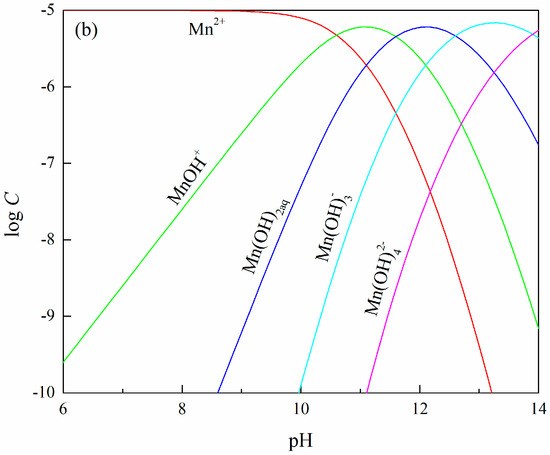 Species distribution diagrams of metal ions: (a) Fe2+; (b) Mn2+; CFe/Mn = 1×10−5 mol·L−1.