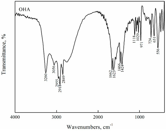 The adsorption mechanism of OHA with quartz in the dissolved solution of wolframite was investigated by FT-IR spectroscopy. FT-IR spectra of OHA and quartz conditioned with OHA at a pH of 9.0, with distilled water or dissolved wolframite solution, are shown in Figure 9 and Figure 10. In the OHA spectrum (Figure 9), the peak at 3260 cm−1 was associated with the overlapping peak of the N–H stretching vibration and the O–H stretching vibration. The peaks at 2955 cm−1, 2918 cm−1, 2849 cm−1, and 724 cm−1 referred to stretching vibrations and bending vibrations of –CH3/–CH2– groups. Additionally, the peaks at 1662 cm−1 and 1623 cm−1 correspond to the characteristic peaks of the C=O stretching vibration and the C=N stretching vibration, respectively [21,22]. In the quartz spectrum (Figure 10a), the peaks at 3427 cm−1 and 1620 cm−1 belonged to the stretching vibration of –OH and the bending vibration of –OH from Si–OH silanol groups, respectively. The characteristic peaks ranging from 900 to 1200 cm−1, and around 797 cm−1 and 693 cm−1 were attributed to the symmetrical stretching and bending vibrations of Si–O bonds [23,24].