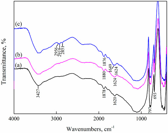 FT-IR spectra of quartz at a pH of 9.0: (a) Quartz; (b) Quartz with OHA in distilled water; (c) Quartz with OHA in the dissolved solution of wolframite.
