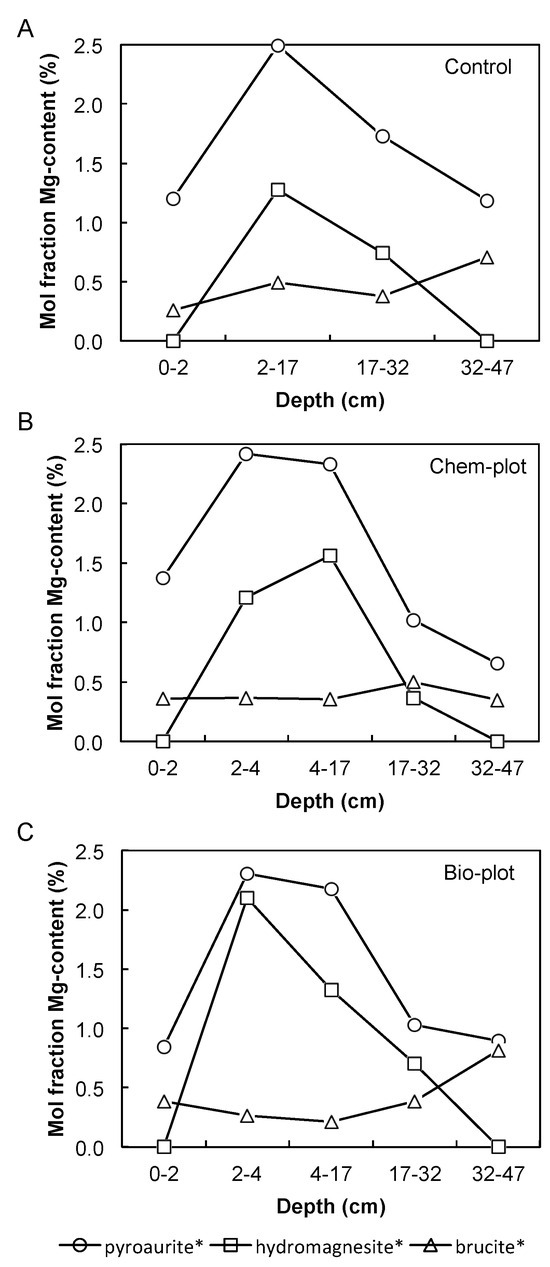 | Depth Profile | Depth (cm) | Mineral Phase (wt %) | |||||||||