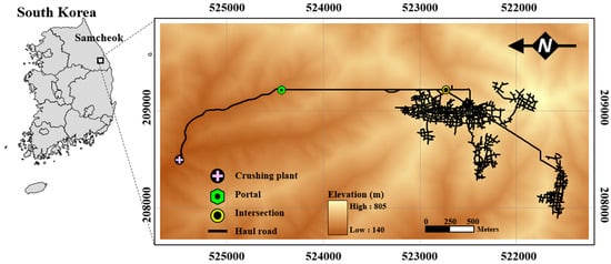 In this study, the Daesung MDI underground limestone mine (37°19′7″ N, 129°6′14″ E) in Samcheok city, Gangwon-do, South Korea was selected as the study area (Figure 1). This underground mine produces 1,500,000 tons of high-quality limestone every year through the room and pillar mining method. The limestone produced is used for various purposes, such as iron and cement manufacturing. The height of the uppermost workplace in the underground mine is 590 m above sea level, and the depth of the workplace is 170 m.