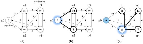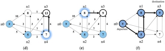 Example of analyzing the optimal path through a vector network using Dijkstra’s algorithm. (a) Vector network consisting of links and nodes; (b) Calculating the travel cost required to travel from n0 to n1 and n2; (c) Calculating the travel cost required to travel from n2 to n1, n3, and n4; (d) Calculating the travel cost required to travel from n4 to n3; (e) Calculating the travel cost required to travel from n1 to n3; (f) The optimal travel route that connects the departure node(n0) and the destination node(n3) at the lowest travel cost.