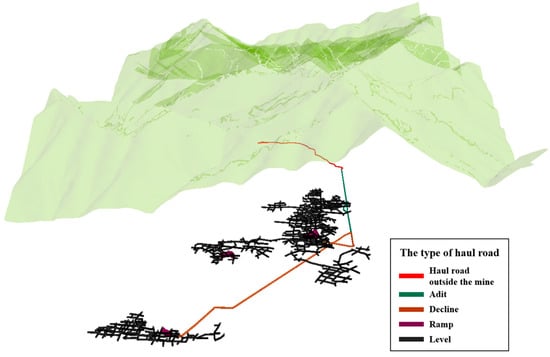 Three-dimensional view of haul roads constructed in the underground mine. Haul roads consist of an adit, declines, ramps, levels, and a haul road outside the mine.