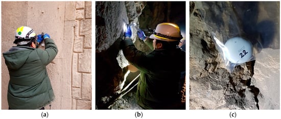 Installing Bluetooth beacons (a) in the portal of the mine and (b) in the underground mine; (c) Bluetooth beacon with minor ID 22.