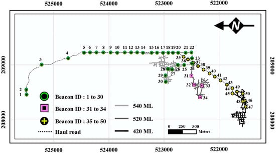In this study, a total of 50 Bluetooth beacons were installed in the 420 ML, 520 ML, and 540 ML workplaces in the underground mine where limestone is produced and along all of the haul roads on which dump trucks travel in order to enter the workplaces (see Figure 4). Bluetooth beacons have advantages for use in underground mines: (a) they offer outstanding signal detection and recognition capability in extreme environments; (b) it is possible to deploy them in an easier and cheaper way than other wireless communication systems, because smartphones can be used as beacon recognition terminals; and, (c) it is easy to develop applications for them, insofar as the Software Development Kit (SDK) for Bluetooth beacon products is available to the public [47,53].