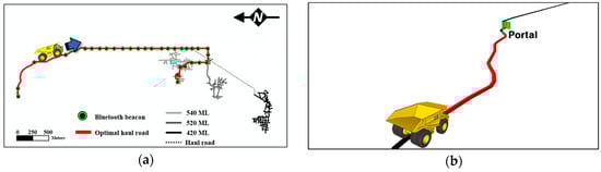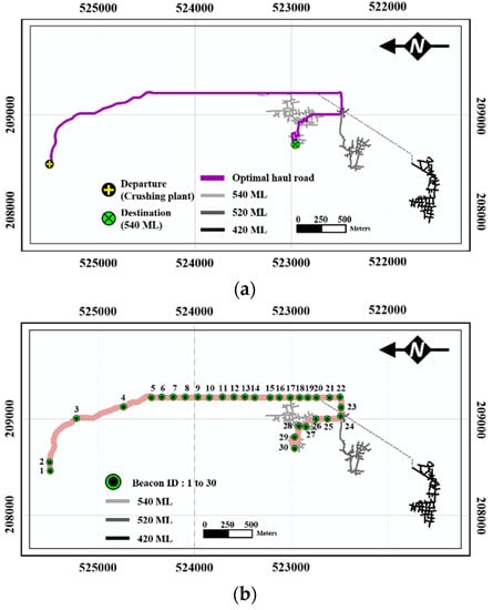 (a) Optimal haul road connecting the crushing plant and 540 ML workplace; (b) Bluetooth beacons that installed along the optimal haul road.