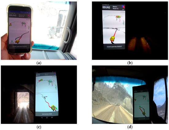 Results of testing the BBUNS application during the haulage operation when (a) leaving the crushing plant, (b) driving toward the 540 ML workplace, (c) passing by the portal of the underground mine, and (d) returning to the crushing plant.