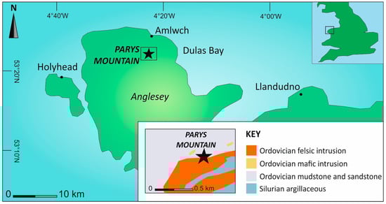 Location of Parys Mountain on the island of Anglesey (North Wales, UK) and, bottom inset, simplified geological map of Parys Mountain and surrounding area (adapted from [17,18,19,20,21,22]).