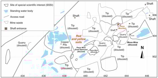 1:4000 scale map of Parys Mountain former workings (including the Parys Mine and Mona Mine), disused tips, and quarries (adapted from [19]).