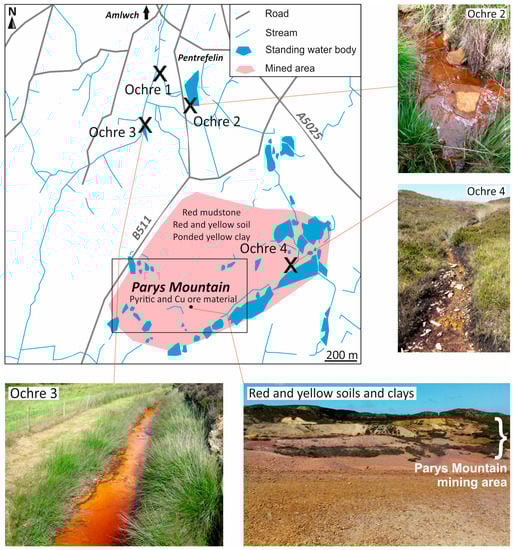 Standing pools of mine water (produced during extraction activity) are evident at the surface of Parys Mountain and also underground. Yellow soils and clays are thicker and more widespread, formed from natural weathering of the bedrock, unrelated to sintering, refining, and beneficiation activities. Yellow soils and clays contain quartz, pyrite, gypsum, limonite, jarosite, and monazite (SEM-EDS analysis). Mine drainage from the former workings are deposited in nearby natural stream systems, with precipitation of Fe(III) (oxy)hydroxides in drainage channels, resulting in yellow-orange ochre sediment deposits. Four ochre-bearing streams were sampled on Parys Mountain and the surrounding areas for ochre sediment and stream water (where present): a dried ochre deposit (Ochre 1—ochre sediment only), two ochre-bearing streams on the slopes to the north of former workings (Ochre 2 and Ochre 3), and an ochre-bearing stream on top of the former workings (Ochre 4) (Figure 2).
