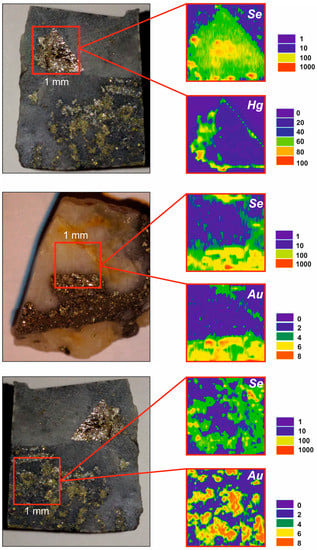 Trace element analysis of polished blocks was performed by using a New Wave laser ablation system UP213 nm (New Wave Research, Fremont, CA, USA) coupled to an inductively coupled plasma-mass spectrometry (ICP-MS) Agilent 7900 (Agilent Technologies, Tokyo, Japan). The laser beam was fired with a spot size of 100 µm moving in straight line, a 10 Hz repetition rate, and at 50 µm·s−1 ablation speed with 1 J·cm2 energy. Before ablation, a warm-up of 15 s was applied with 15 s delay between each ablation. Settings parameters were optimised daily by using a NIST Glass 612 (NIST, Gaithersburg, MD, USA) to obtain the maximum sensitivity and to ensure low oxide formation. In order to remove possible interferences which could affect Se measurement, a reaction cell was used with hydrogen gas (between 3.0 and 3.5 mL/min optimisation to decrease Se background). MASS-1 Synthetic Polymetal Sulfide (USGS, Reston, VA, USA) was used to provide a semi-quantification by calculating the ratio concentration (µg·g−1)/counts per seconds, and multiplying this ratio by the sample counts. Certified and informative values are available by request through the US Geological Survey website.