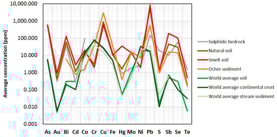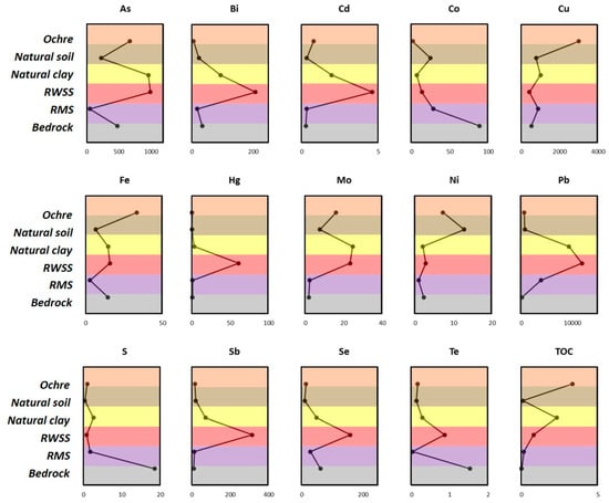 All results are shown in Tables S1 and S2. Both natural and smelt deposits are enriched compared to world average values [44,45,46,47] (Table S1; Figure 6), typically by 2–3 orders of magnitude. Overall, there is a general decrease in average concentrations of Co, S, and Te from the bedrock source to the final weathered products (Figure 7). Concentrations of Cu, Fe, Mo, Ni, and TOC increase from source to ochre sediments, while As and Cd vary across samples (Figure 7). There are high average concentrations of As, Bi, Hg, Mo, Pb, Sb, Se, and Te in weathered smelt materials. Excluding TOC, which is inherently enriched in weathered products due to vegetation and biological processes, the highest enrichment factor for any element is Pb in weathered smelt, which is enriched by a factor of 82.1 compared to the bedrock concentrations. Lead is enriched in all weathered products compared to the bedrock. Mercury and Sb are also highly enriched in weathered smelt (67.7 and 32.6 respectively) compared to the bedrock.