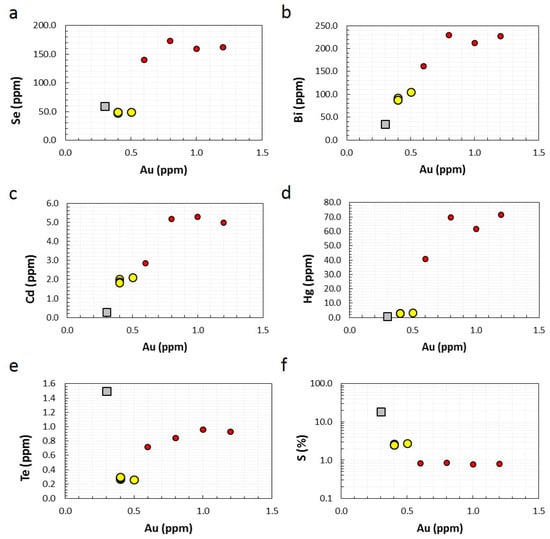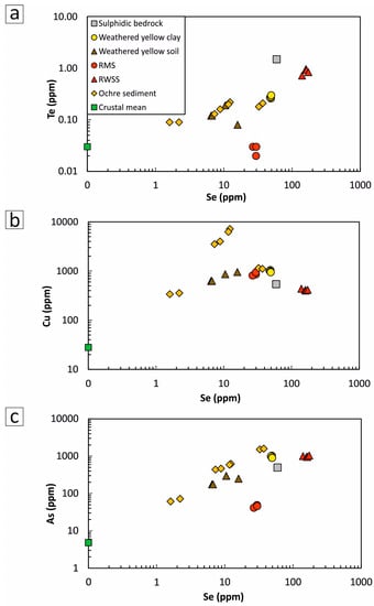 Sulphidic bedrock contains 0.3 ppm of Au. Across all samples, Au shows minor correlation with Se, Bi, Cd, and Hg (Figure 9). Correlation coefficients for all trace elements and statistical significance of Au correlation coefficients are shown in Table S5. There is also a strong correlation between S and Au (r correlation value of −0.82). Smelt samples show high Au content (up to 1.2 ppm), as well as natural yellow clays (0.4–0.5 ppm Au content). Ochre sediments and yellow soils do not host Au above level of detection. Given the presence of Au in whole rock, waste, and weathered samples, it is possible to identify potential Au pathfinder elements across Parys Mountain samples, as previous studies have shown that Se and Te can also act as Au pathfinder elements [48,49,50,51,52,53]. Figure 9 shows that Se, Bi, Cd, and Hg have a positive correlation with Au, and can act as pathfinder elements for Au in natural and waste soils and clays at Parys Mountain.