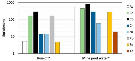 Trace element enrichment (*compared to world average stream water compositions) of ochre-bearing stream water (run-off) and underground (mine pool water) samples.