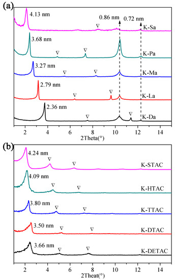 The interlayer structure of the kaolinite intercalation compounds with different guest species can be conveniently monitored by XRD. In this study, the dependence of the interlayer structure on the chain length has been investigated. Because the XRD patterns of K-D and K-M have been reported in previous literature [34], they are not presented in this paper. Figure 1 shows the XRD patterns of kaolinite/fatty acid intercalation compounds and kaolinite/quaternary ammonium salt intercalation compounds, respectively. XRD data of the intercalation products show that their basal spacings are expanded to a length much longer than 0.72 nm, the basal spacing of K-Fas and K-Qas, indicating that Fas and Qas intercalate into kaolinite layers. Figure 1 also displays that the 001 reflection of the two types of intercalation compounds shifted to a low angle (2θ) with the increase in the alkyl chain length. In the case of Fas, the XRD patterns presented a narrow and intense 001 reflection, suggesting that the layer structure of kaolinite remains intact during the intercalation and exfoliation processes. Moreover, reflection at 0.86 nm for K-Fas, corresponding to K-M, was still observed. This indicated that the intercalation efficiency of fatty acids into kaolinite was incomplete. In addition, the other reflections were assigned to the second- and third-order diffractions of K-Fas. The basal spacings varied between 2.36, 2.79, 3.27, 3.68, and 4.13 nm in K-Da, K-La, K-Ma, K-Pa, and K-Sa, respectively. Similarly, the interlamellar spaces of K-Qas varied between 3.66, 3.50, 3.80, 4.09 and 4.24 nm.