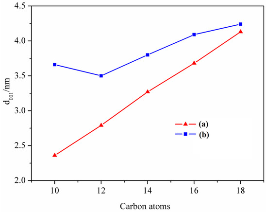 Relation curves of basal spacing and number of carbon atoms in the alkyl chain: (a) kaolinite/fatty acid intercalation compounds (K-Fas); (b) kaolinite/quaternary ammonium salts intercalation compounds (K-Qas).